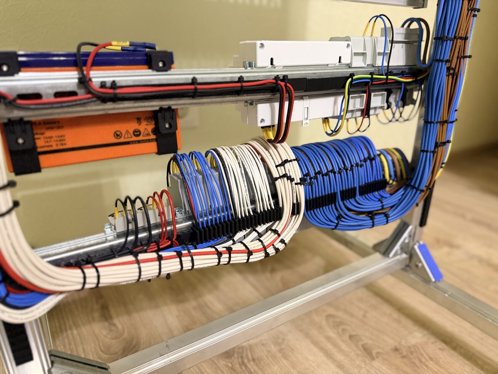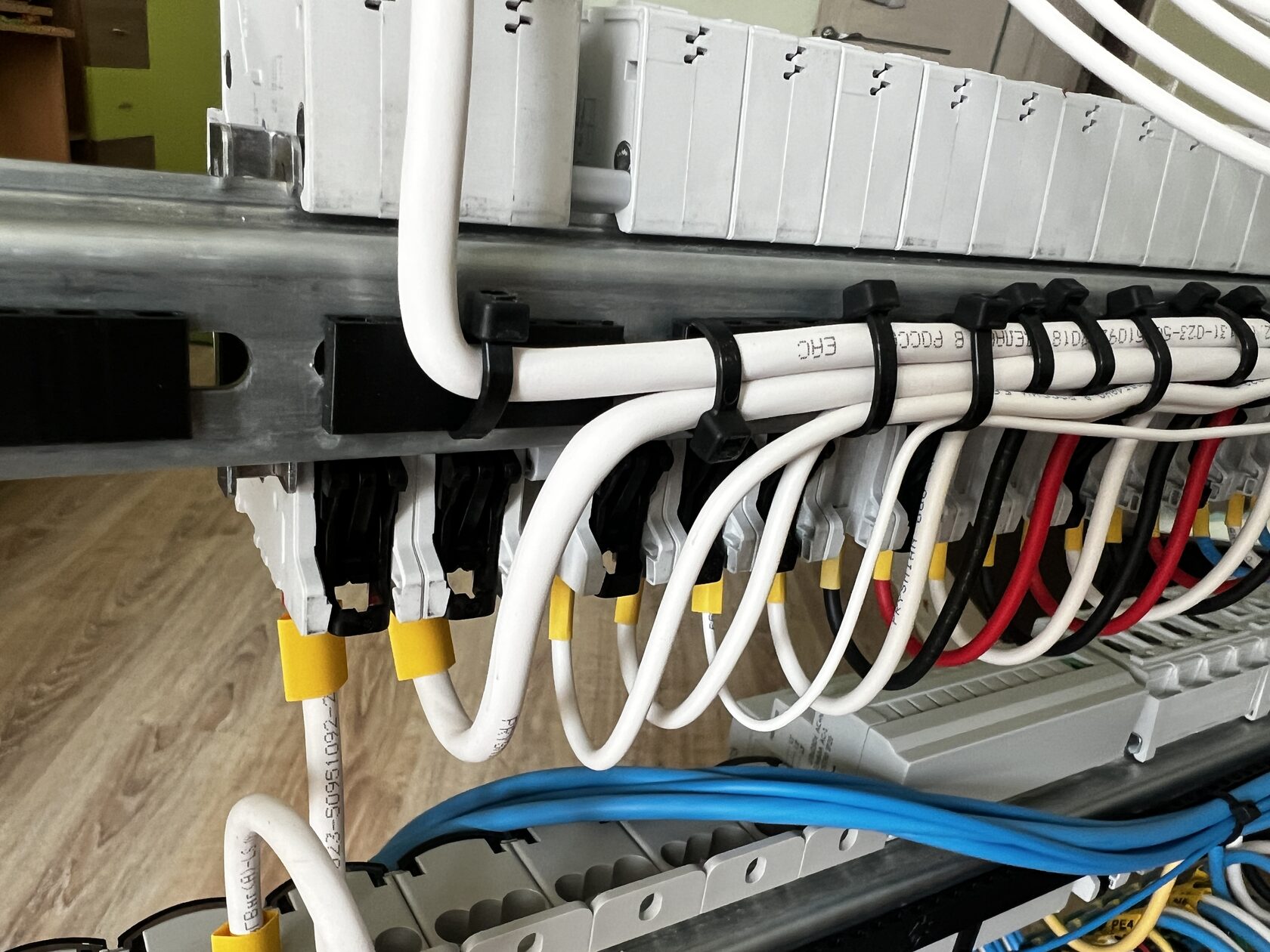 А самое важное это удобство обслуживания. Ошибся при обвязке кабеля? Не проблема! Срезал старую стяжку, провёл новую и всё. Не надо снимать автоматы и протаскивать стяжку через отверстия заново.