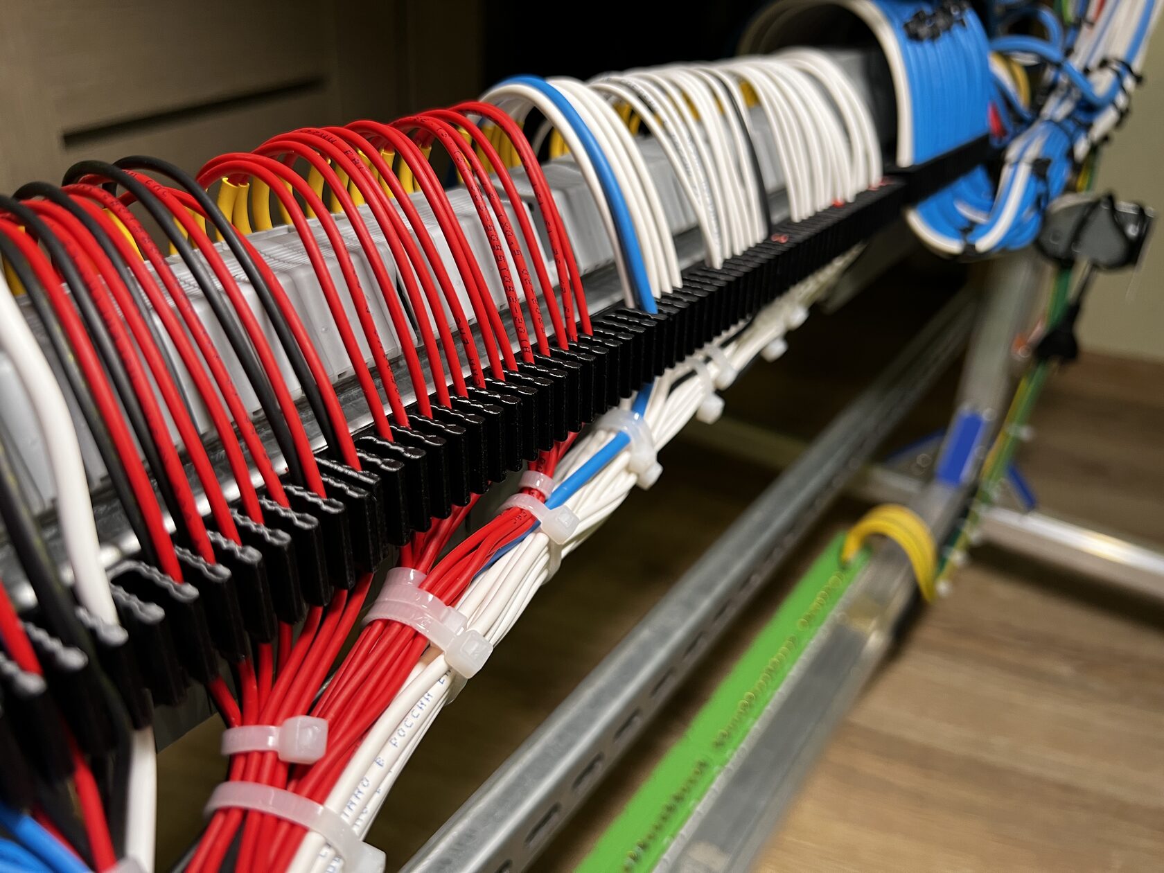 На фотографиях я этого не показываю, потому что после формирования жгута и крепления к боковинам щита провод уже никуда не денется - дополнительная фиксация к рейке просто не требуется.